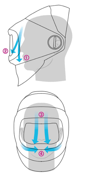 Per un maggiore comfort, l’innovativo sistema a flusso d’aria variabile consente di indirizzare il flusso d’aria verso il viso (1) , la visiera (2) o una posizione intermedia.