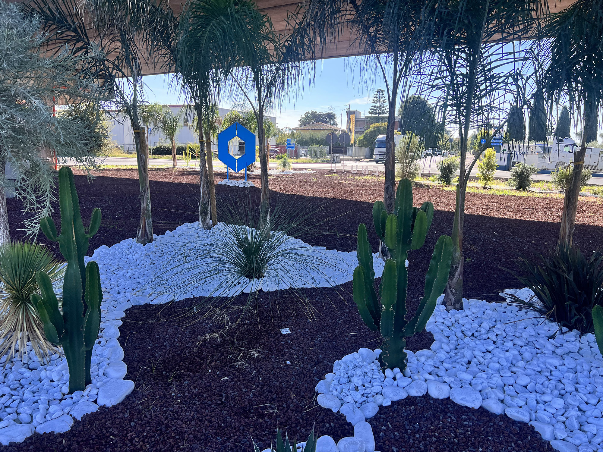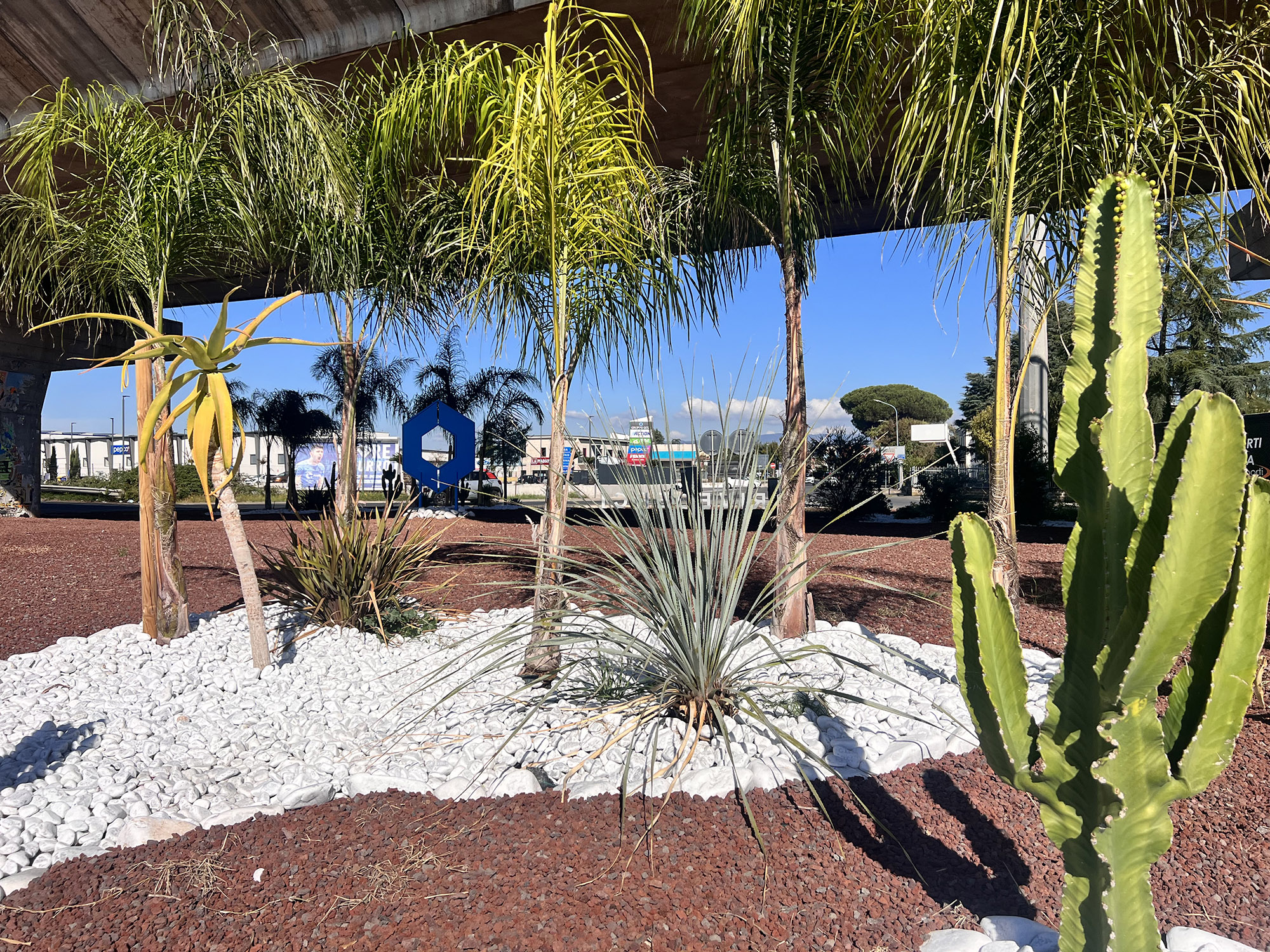 La rotatoria si divide in 4 settori; due sono dedicati al “Giardino Mediterraneo” che si ispira alla vegetazione e alle caratteristiche tipiche della macchia mediterranea e due, invece, dedicati a un “Giardino del Deserto”, con piante grasse sabbia e rocce.